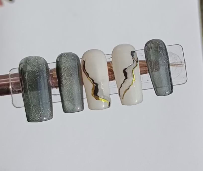 Elevate your look with this stunning cat eye magnetic nail design featuring mesmerizing light-shifting effects that create depth and dimension. These medium-length square nails offer the perfect balance of elegance and practicality.
